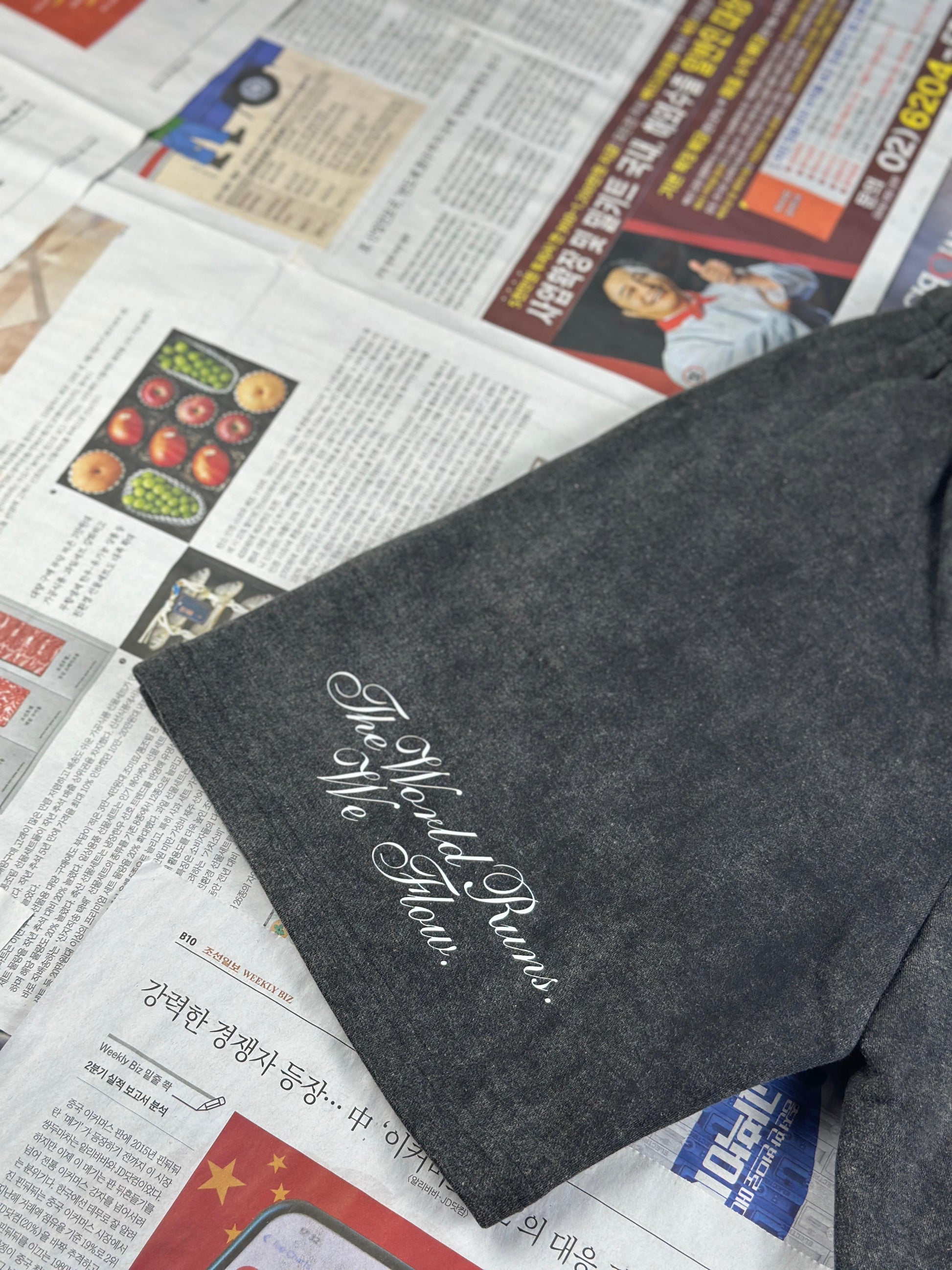 The rope drawstrings echo organic simplicity, and on the back, a quiet reminder whispers: “The World Runs, We Flow.” Designed for those who carry both power and ease in their stride.